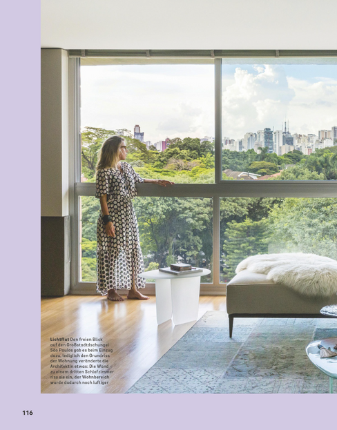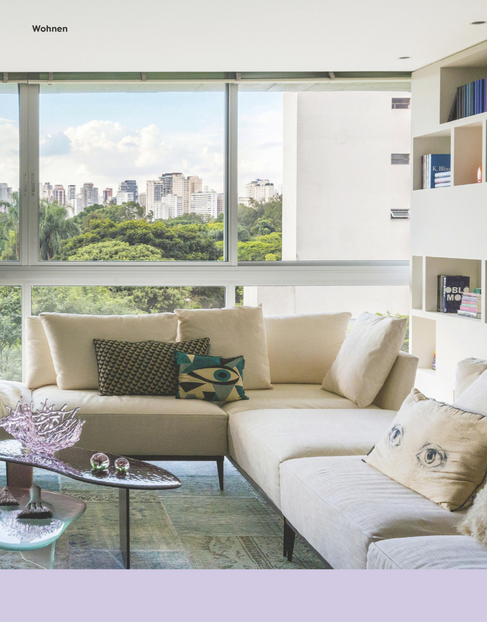 Brutalismo significa linhas nítidas e concreto bruto. A arquiteta Patricia Faragone contrasta isso em seu refúgio sobre os telhados de São Paulo com cores quentes e um toque de estilo étnico.